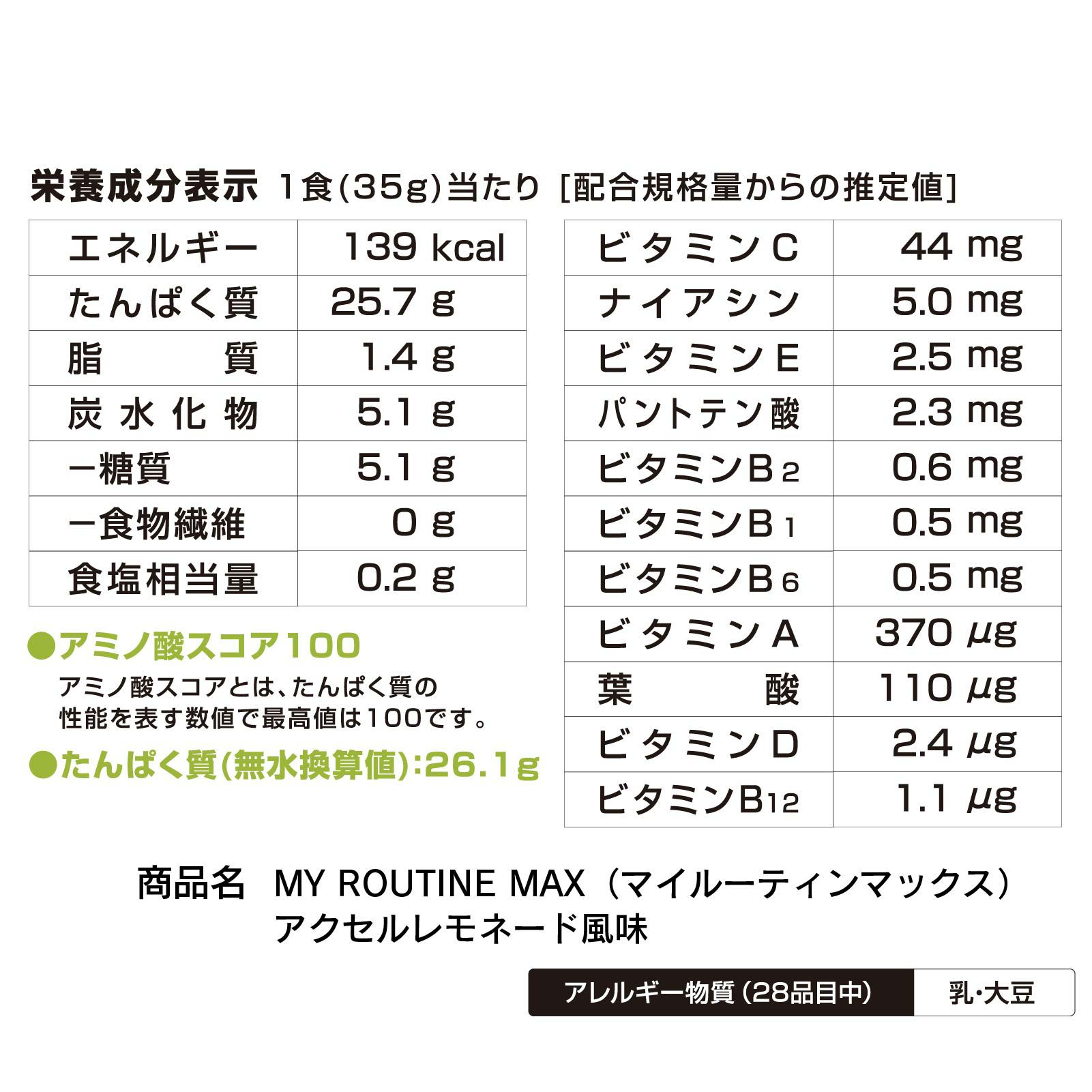 最強スペックのタンパク質高配合プロテイン。1食あたりのたんぱく質量に、とにかくこだわりました。タンパク質合成を高めるためには、20~25gのたんぱく質摂取が実は必要。マイルーティーンMAXは、全味MAX(25g)の摂取量を追求しました。また、筋肉の超回復、成長をサポートするHMBを配合。なりたい身体をともに目指し、自分を高めて、打ち勝つ強さと身体作りをサポートします。1食分(35g)を、お好みに応じて150-200mL程度の水または牛乳に溶解してお召し上がりください。(付属のスプーン山盛り2杯で約35gです。)