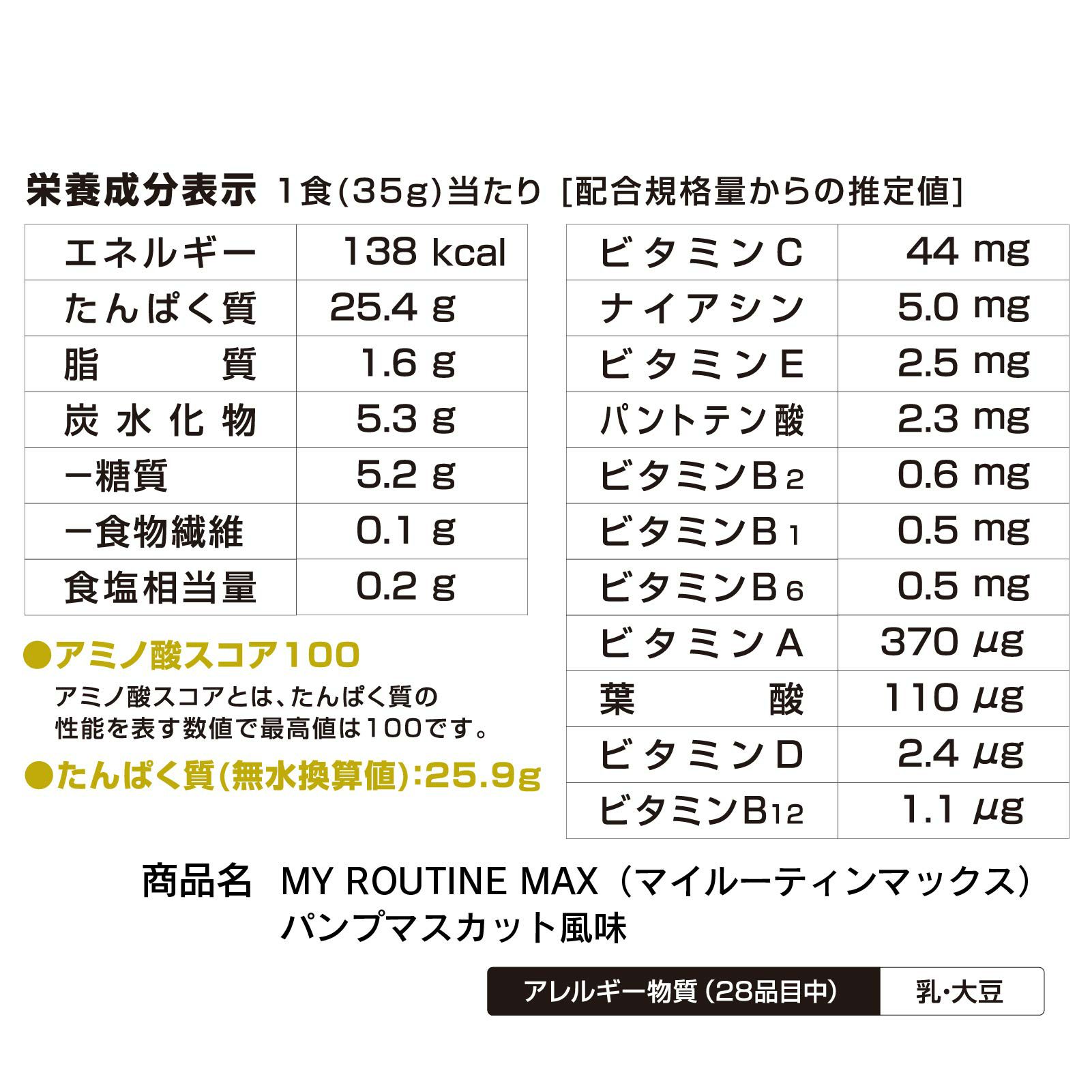 最強スペックのタンパク質高配合プロテイン。1食あたりのたんぱく質量に、とにかくこだわりました。タンパク質合成を高めるためには、20~25gのたんぱく質摂取が実は必要。マイルーティーンMAXは、全味MAX(25g)の摂取量を追求しました。また、筋肉の超回復、成長をサポートするHMBを配合。なりたい身体をともに目指し、自分を高めて、打ち勝つ強さと身体作りをサポートします。1食分(35g)を、お好みに応じて150-200mL程度の水または牛乳に溶解してお召し上がりください。(付属のスプーン山盛り2杯で約35gです。)
