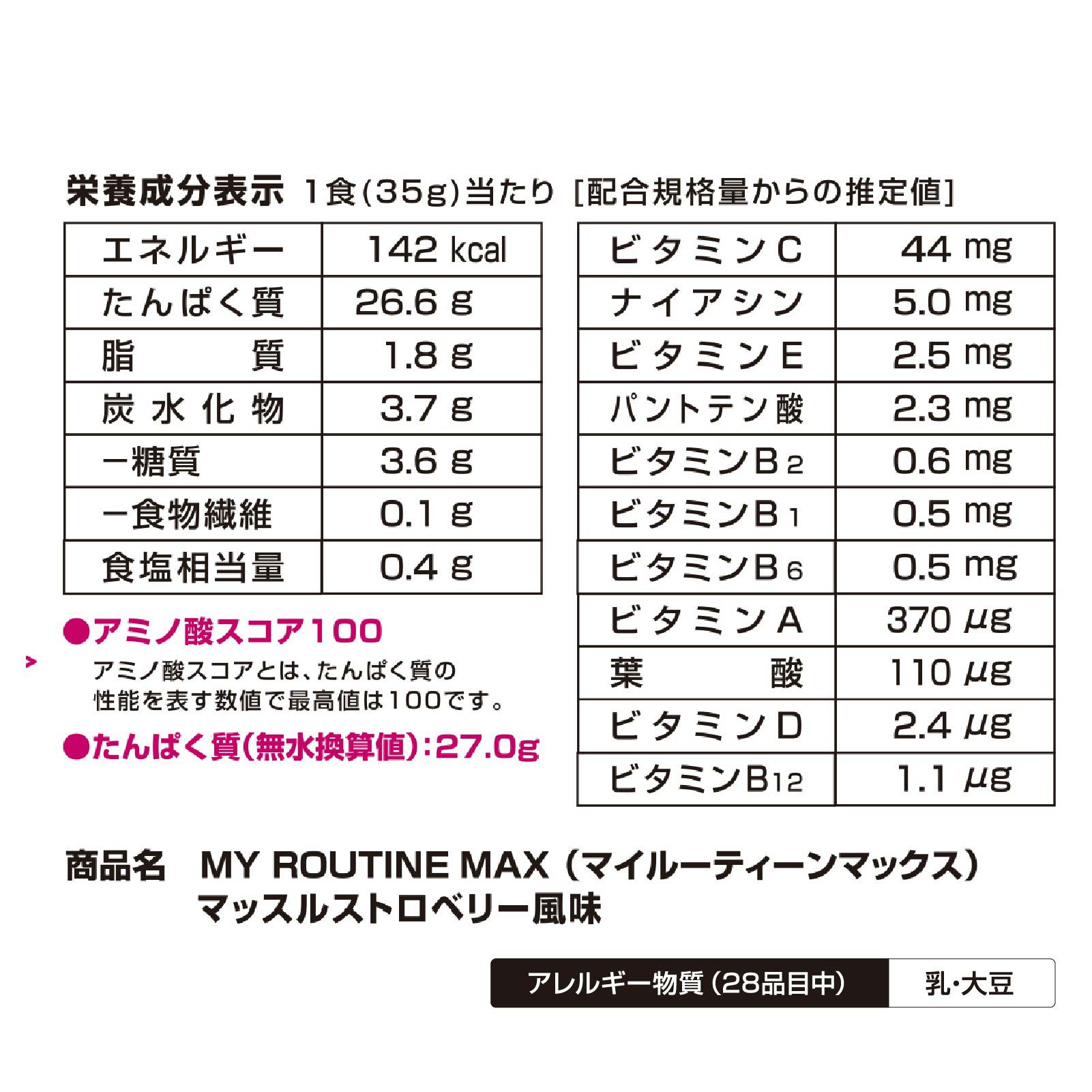 最強スペックのタンパク質高配合プロテイン。1食あたりのたんぱく質量に、とにかくこだわりました。タンパク質合成を高めるためには、20~25gのたんぱく質摂取が実は必要。マイルーティーンMAXは、全味MAX(25g)の摂取量を追求しました。また、筋肉の超回復、成長をサポートするHMBを配合。なりたい身体をともに目指し、自分を高めて、打ち勝つ強さと身体作りをサポートします。1食分(35g)を、お好みに応じて150-200mL程度の水または牛乳に溶解してお召し上がりください。(付属のスプーン山盛り2杯で約35gです。)
