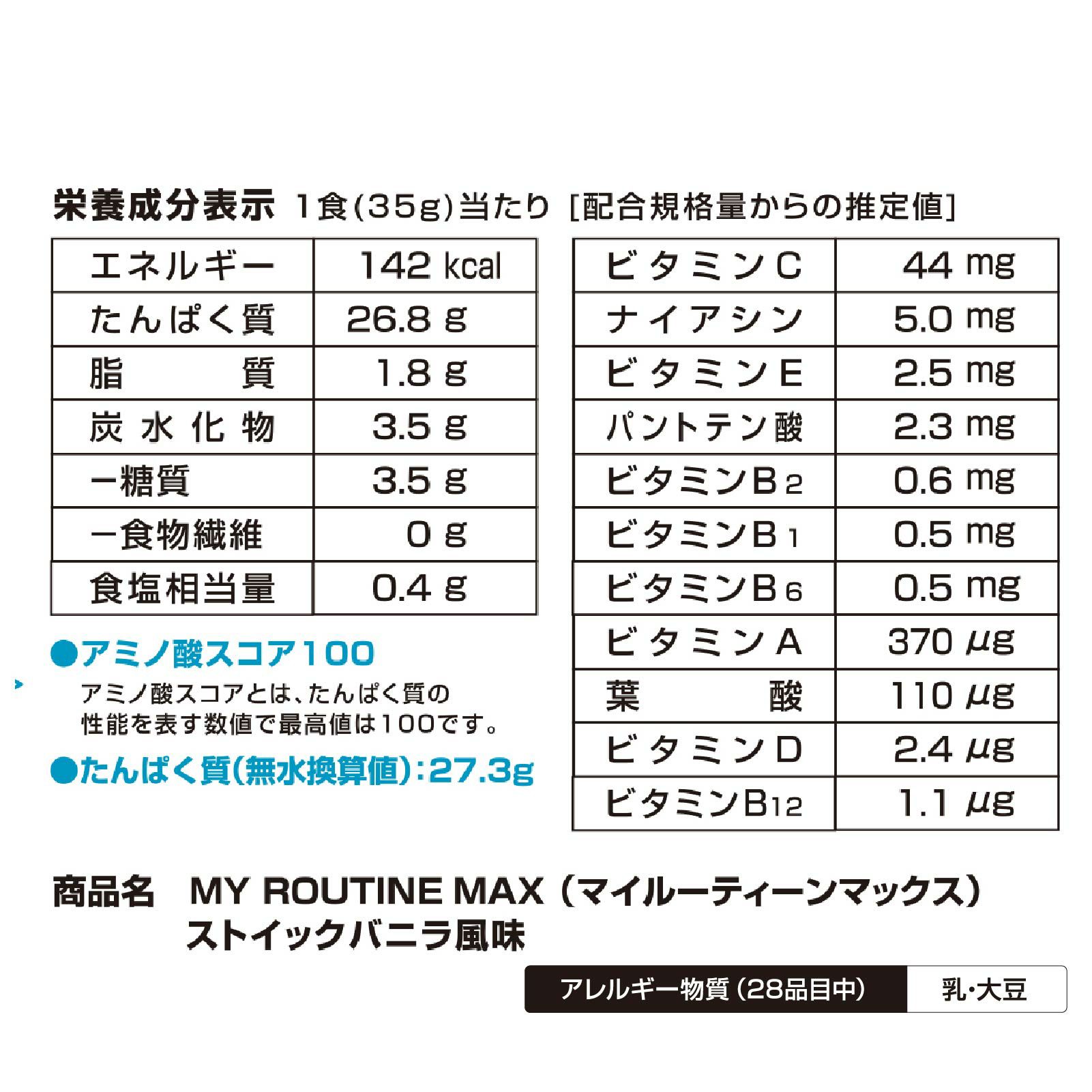 最強スペックのタンパク質高配合プロテイン。1食あたりのたんぱく質量に、とにかくこだわりました。タンパク質合成を高めるためには、20~25gのたんぱく質摂取が実は必要。マイルーティーンMAXは、全味MAX(25g)の摂取量を追求しました。また、筋肉の超回復、成長をサポートするHMBを配合。なりたい身体をともに目指し、自分を高めて、打ち勝つ強さと身体作りをサポートします。1食分(35g)を、お好みに応じて150-200mL程度の水または牛乳に溶解してお召し上がりください。(付属のスプーン山盛り2杯で約35gです。)